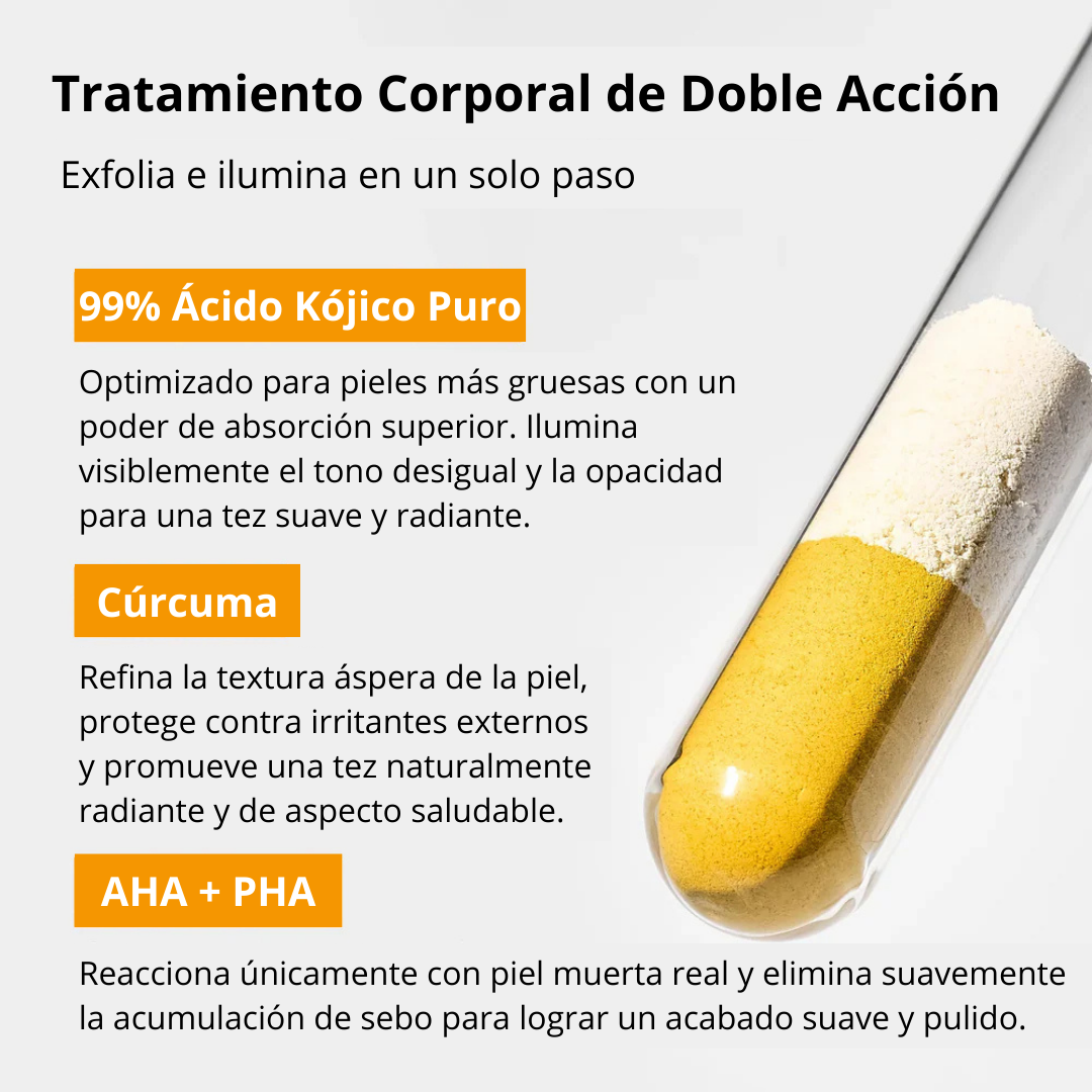 Una bruma exfoliante corporal y facial de última generación que renueva tu piel desde el primer uso. Con una fórmula potente pero delicada que combina ácido kójico de alta pureza, extracto de cúrcuma y activos iluminadores, este spray transforma la textura opaca y áspera en una piel suave, radiante y visiblemente más uniforme.